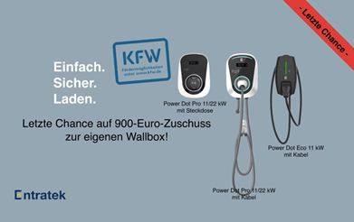 Seit dem 24.11.2020 bezuschusst die KfW in Deutschland den Erwerb unserer Entratek Power Dot Wallboxen im Rahmen des KfW-Programms mit 900€. Eigentümer, Wohnungseigentümergemeinschaften, Mieter und Vermieter können für die Anschaffung...