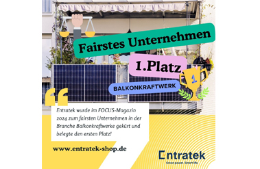 (Norderstedt, 14.06.2023) entratek-shop.de, ein führender Anbieter von Balkonkraftwerken, wurde in Zusammenarbeit mit DEUTSCHLAND TEST als "Fairstes Unternehmen" in der Branche "Balkonkraftwerke" ausgezeichnet....
