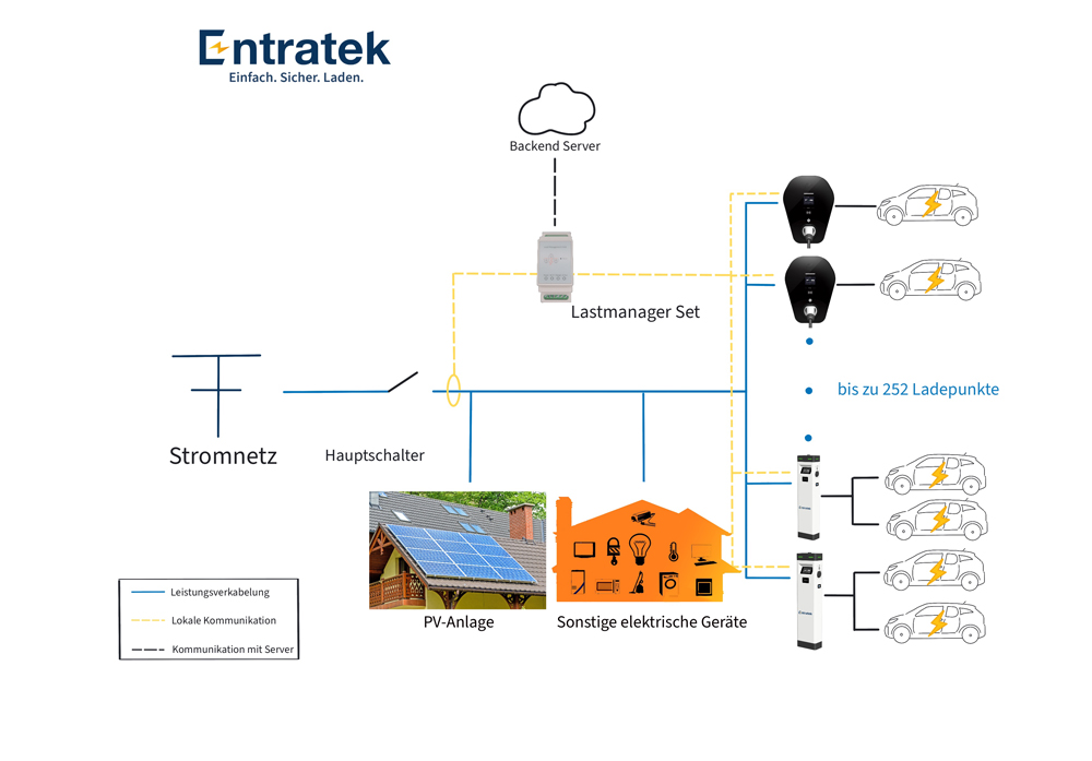 Mit dem neuen Entratek Lastmanager Set wird das Lastmanagement noch leistungsfähiger und intelligenter. Kombiniert mit den Entratek Ladestationen Power Dot Fix und Power Arrow Dual, können Nutzer bis zu 252 Elektroautos gleichzeitig laden, ohne das Netz zu überlasten. Übersteigt die mögliche Ladeleistung aller einzelnen Elektroautos diesen Wert, wird die Ladeleistung aller Ladestationen automatisch reduziert, bis wieder ausreichend Leistung verfügbar ist. Dadurch sparen Kunden sich hohe Kosten für die Aufrüstung Ihres Stromanschlusses und nutzen die vorhandene Leistung ideal aus.